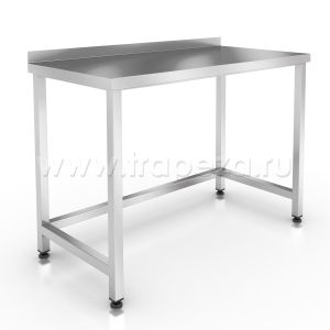 Стол рабочий усиленный, с ножками из профильной трубы, с бортом, с полкой, конструкция разборная, нержавеющая сталь. Для эксплуатации стол необходимо установить между двумя неподвижными элементами. При установке с края из-за маленькой длины стола, возможно его опрокидывание. Ножки регулируются по высоте. Столешница усилена ДСП. Максимальная распределенная нагрузка на столешницу 130кг.